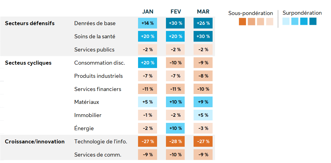 Le volet de rotation sectorielle a maintenu une exposition constante aux produits de première nécessité, aux soins de santé et aux matériaux au cours du T1. Cette approche traduit un positionnement défensif en cas de hausses des préoccupations inflationnistes. Cependant, ce positionnement a évolué au fil des changements de la conjoncture. En janvier, le portefeuille a combiné une approche défensive avec un potentiel de croissance des titres cycliques grâce à la consommation discrétionnaire. En février, notre positionnement est passé de la consommation discrétionnaire à l’énergie, ce qui témoigne d’un changement de leadership émergent dans les secteurs liés aux produits de première nécessité. En mars, notre positionnement a basculé de l’énergie à l’immobilier, car le secteur a démontré des signes précoces de reprise après une sous-performance soutenue.