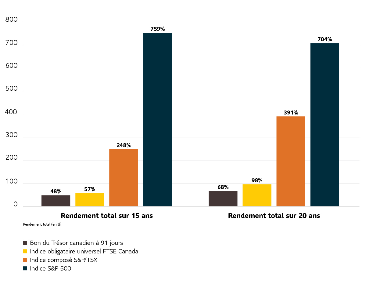 Historiquement, d’autres catégories d’actifs, comme les actions et les obligations, obtiennent de meilleurs rendements à long terme, mais peuvent comporter plus de risque à court terme. Cependant, à long terme, leurs avantages sont évidents.